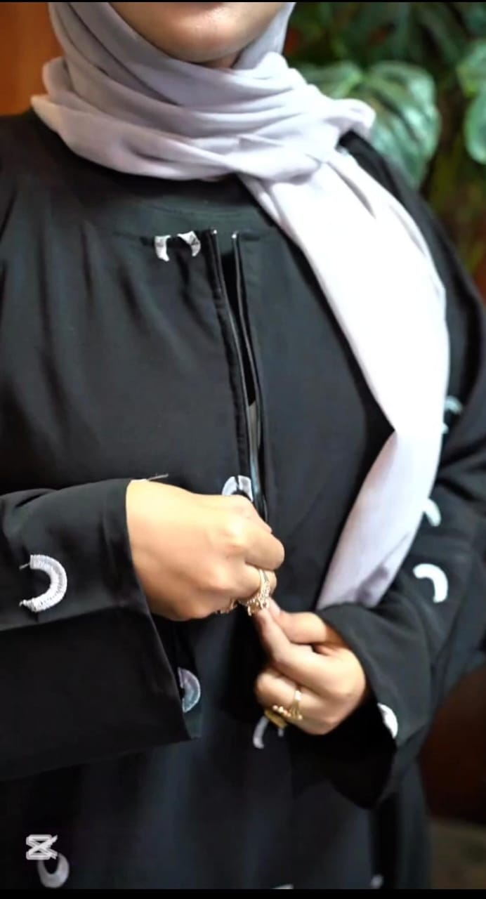 Elevate your modest wardrobe with this stunning moon embroidered abaya! Made from high-quality peach jorjet fabric, this abaya is perfect for formal occasions.